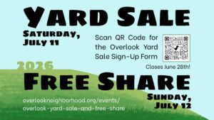 Make your plans for the annual Overlook Yard Sale & Free Share, a popular neighborhood event for clearing basements, garages, and spare rooms. This year’s clear out is on the 2nd weekend of July (July 11 & 12, 2026) and coincides with Overlook Porchfest and the Mississippi Street Fair – there will be lots of people in the neighborhood!